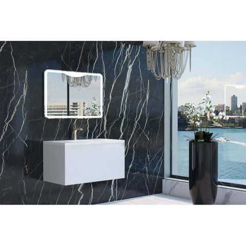 European design wall hung vanity with 1 external and 1 inner soft close premium drawers and solid surface basin.